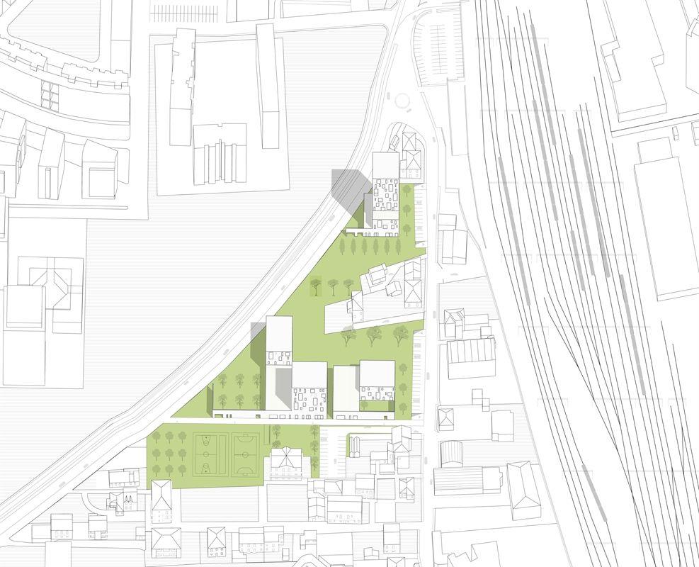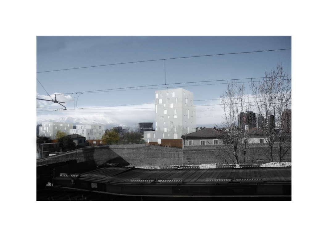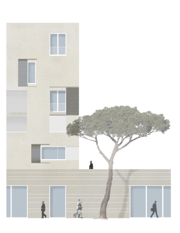 Una parte a bassa densità riconnette il lotto di progetto al tessuto esistente, più a nord una torre residenziale si confronta con i recenti sviluppi immobiliari di Pescara Porta Nuova.