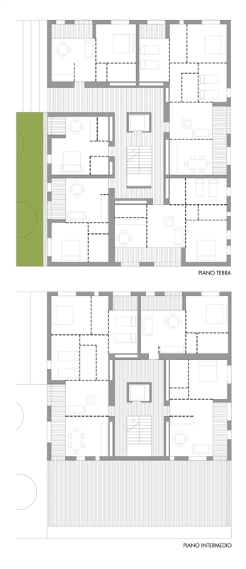 Il progetto delle abitazioni evidenzia la volontà progettuale di offrire un range dimensionale ampio e distribuito in percentuali tali da intercettare le richieste dell’utenza dei nostri giorni. All’interno di una pianta di dimensioni 18x24 mt si è cercato di sviluppare spazi flessibili in maniera tale da garantire a ciascuna utenza una propria libertà di gestione ed interpretazione del proprio spazio domestico. Gli alloggi si articolano attorno al vano scala centrale, concepito come fulcro strutturale ed impiantistico. La prima fascia interna delle abitazioni è pertanto immaginata come fascia servizi per poi destinare la porzione principale dell’alloggio alle attività principali dell’abitare. L’articolazione degli spazi interni è la medesima sia per la porzione a bassa che per quella ad alta densità.