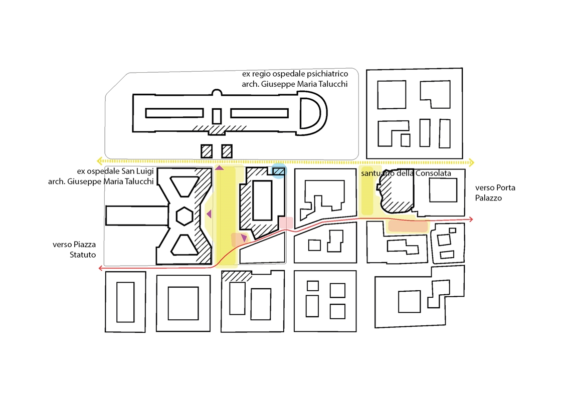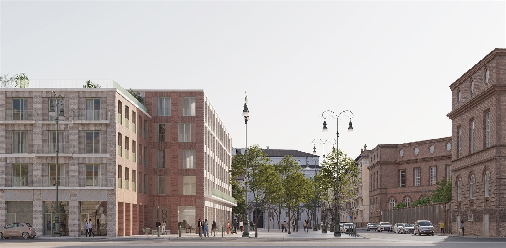 Dal punto di vista morfologico il disegno del progetto prevede un'attenta considerazione del contesto urbano esistente del quartiere “Quadrilatero” e della tipologia architettonica a blocco con cortile, con l’introduzione di alcune di alcune soluzioni specifiche.