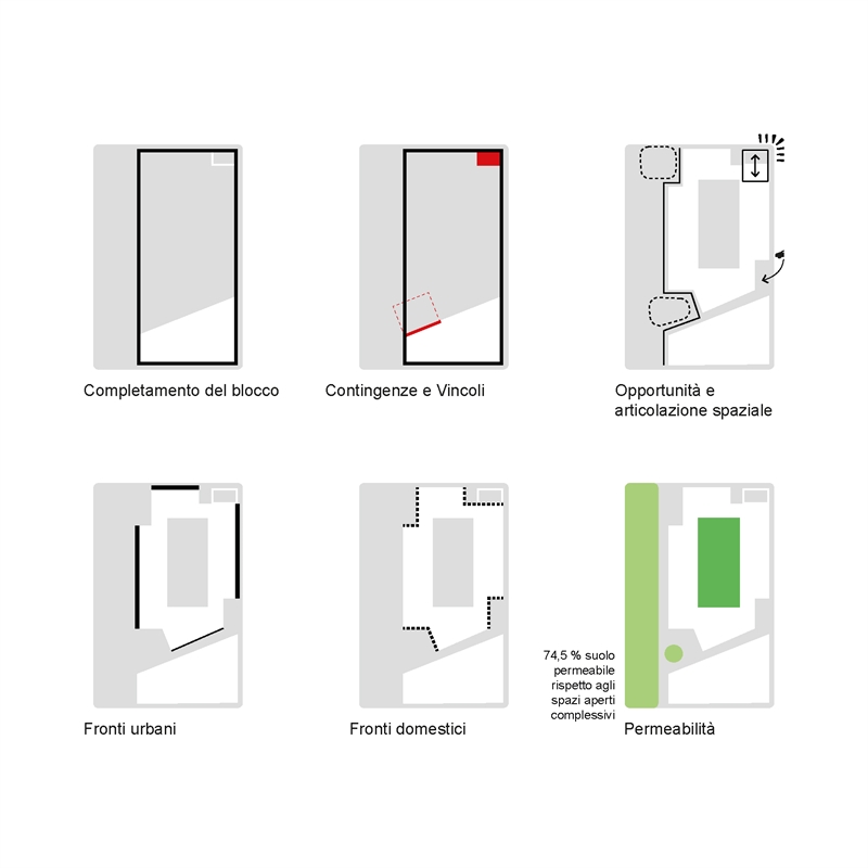 Al disegno di uno spazio pubblico chiaro e ben connesso con il suo intorno, si succedono una serie di gesti minuti, alla scala dell’edificio, che marcano l’ingresso nella corte attraverso l’arretramento dei quattro angoli. Queste situazioni, che nascono da esigenze pratiche: il bisogno di rispettare le distanze dei fronti nella parte sud-occidentale dell’edificio, la necessità di integrare il padiglione storico presente nel bordo nord-orientale del sito, si trasformano in opportunità per il nuovo progetto, in grado di creare una ricca articolazione spaziale e una graduale transizione dallo spazio pubblico a quello privato.