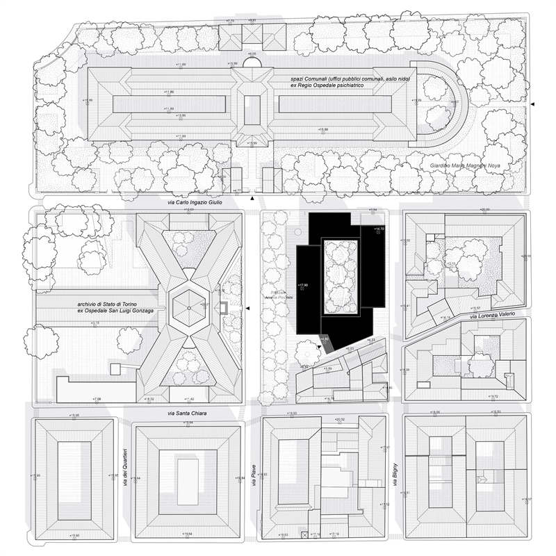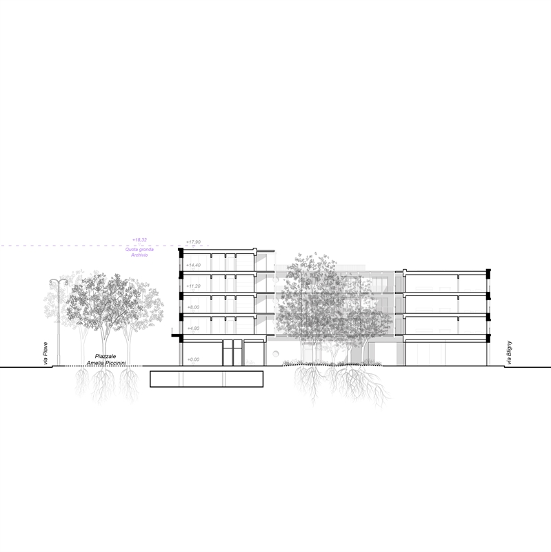 Il gesto principale è l’allineamento del nuovo blocco con il filo degli edifici esistenti presenti nella porzione meridionale del sito, al fine di offrire un grande vuoto longitudinale che funga da nuovo spazio pubblico all’interno del quartiere e metta in comunicazione l’edificio pubblico a nord (Anagrafe, uffici pubblici e asilo nido) e l’Archivio di Stato con la nuova porzione di servizi commerciali presenti al piano terra dell’edificio.