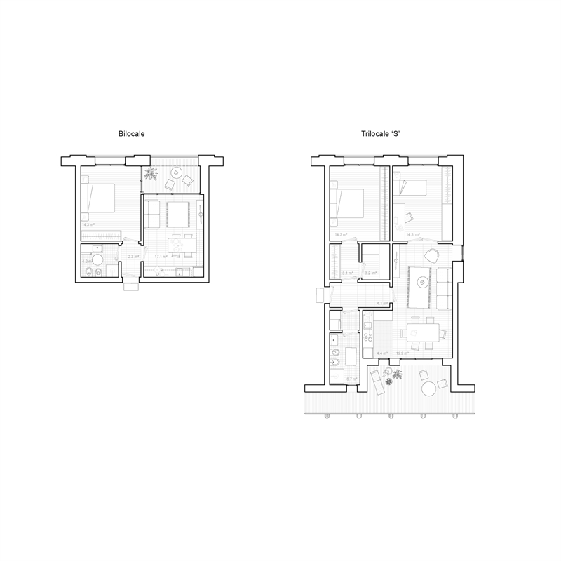 Il progetto risponde alle esigenze della città di Torino di attrarre giovani single, coppie e nuclei di diverse dimensioni sviluppandosi attorno a quattro tipologie residenziali: bilocali, trilocali piccoli ‘S’, trilocali grandi ‘L’ con cucina abitabile e secondo bagno, e quadrilocali.