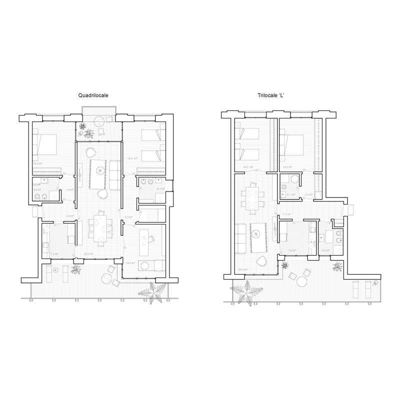 Trilocali e quadrilocali presentano sempre una stanza accessibile direttamente dal soggiorno e che comunica con esso attraverso una porta a doppia anta per dare maggiore flessibilità allo spazio adiacente. Questo può divenire, in alcuni casi, l’estensione del soggiorno, può essere utilizzato come studio / spazio di lavoro per coloro che devono lavorare da casa, oppure può semplicemente essere utilizzato come camera.