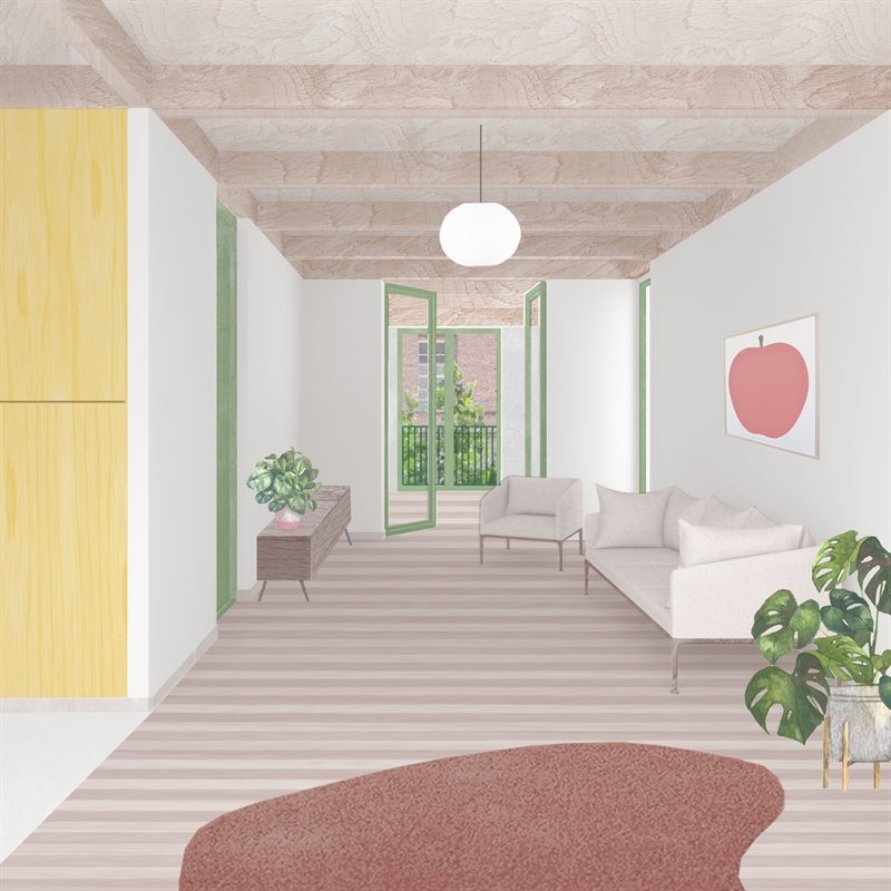 Al suo interno il tema della casa cooperativa è affrontato partendo dal presupposto che, per garantire spazi di condivisione e collettivi efficaci, si deve prima di tutto garantire una sfera privata chiara e ben definita. Su questo principio si basa l’organizzazione degli appartamenti che sono serviti da cinque vani scala posti lungo la facciata interna e accessibili dal cortile, che distribuiscono gli appartamenti attraverso una lobby interna. La manica posta sud, la cui destinazione d’uso è dedicata ad attività lavorative ha una distribuzione ed accesso indipendente rispetto alla parte residenziale dell’edificio, per tutelare la dimensione abitativa ed allo stesso tempo rinforzarne il carattere pubblico.