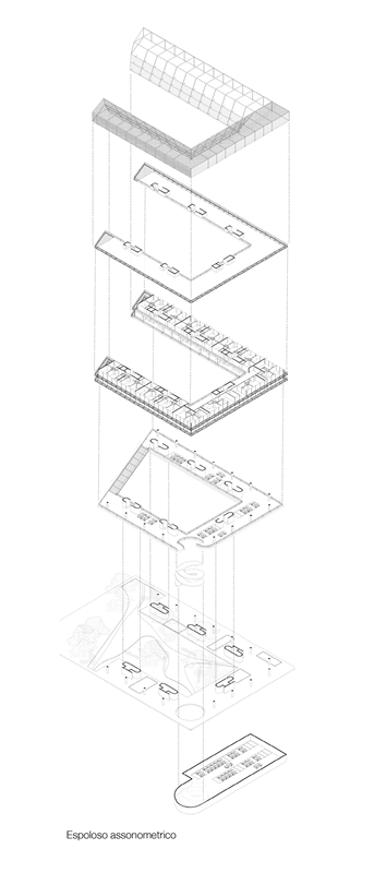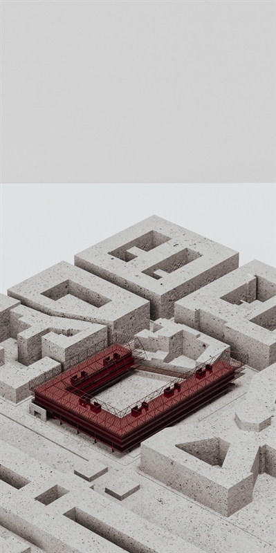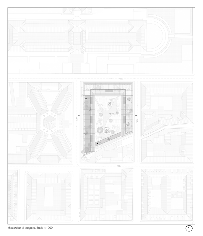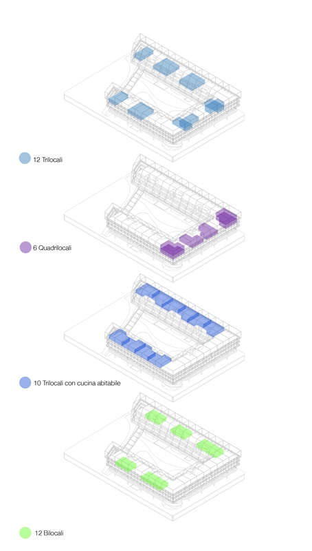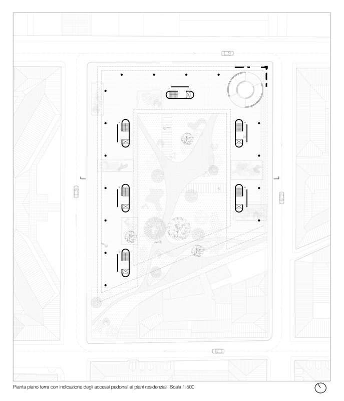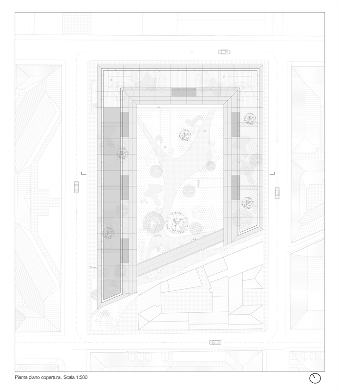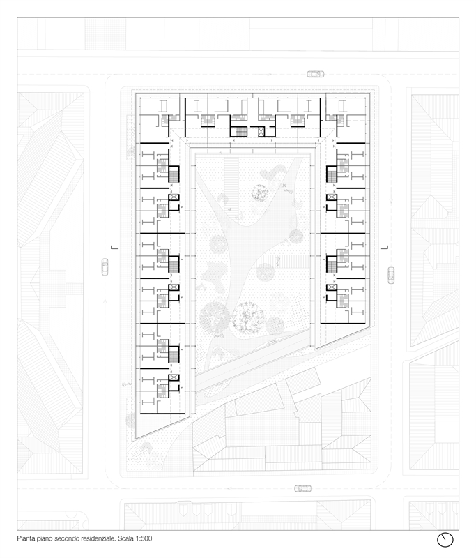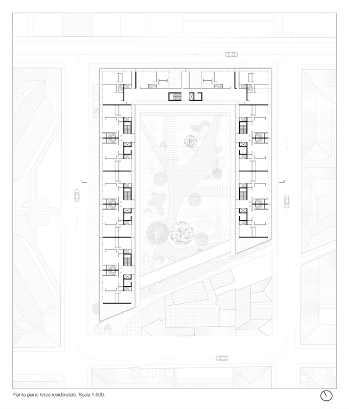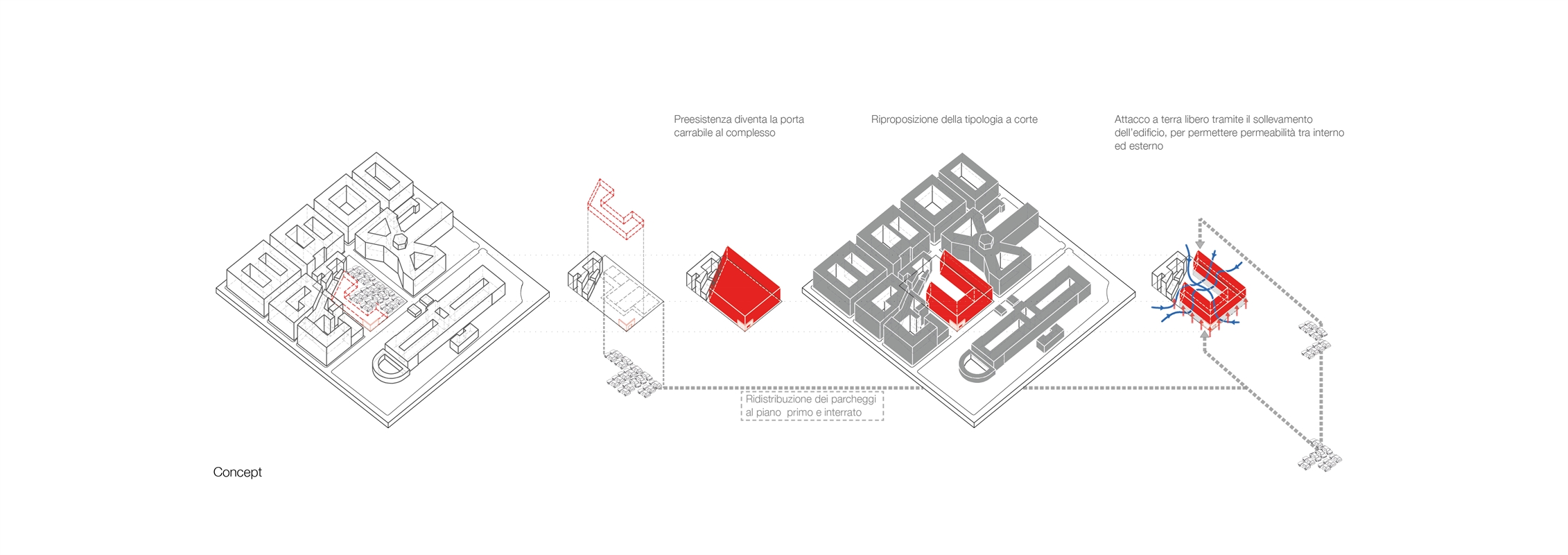 Il complesso abitativo si innesta all’interno di un brano territoriale densamente costruito e solidificato, in un vuoto urbano, dall’identità fortemente legata all’uso pubblico, seppur da ricostituire. Il nuovo complesso abitativo dialoga compositivamente con gli isolati circostanti, ponendosi in continuità con la tipologia urbana a corte che caratterizza l’edificato dell’area.  La composizione planimetrica a corte evolve in alzato in un recinto sospeso, che permette di recuperare lo spazio urbano occupato dall’edificio. La strategia compositiva è volta ad ottenere una compenetrazione tra la dimensione pubblica, con una forte connessione con la città e quella di intimità domestica nella corte interna.