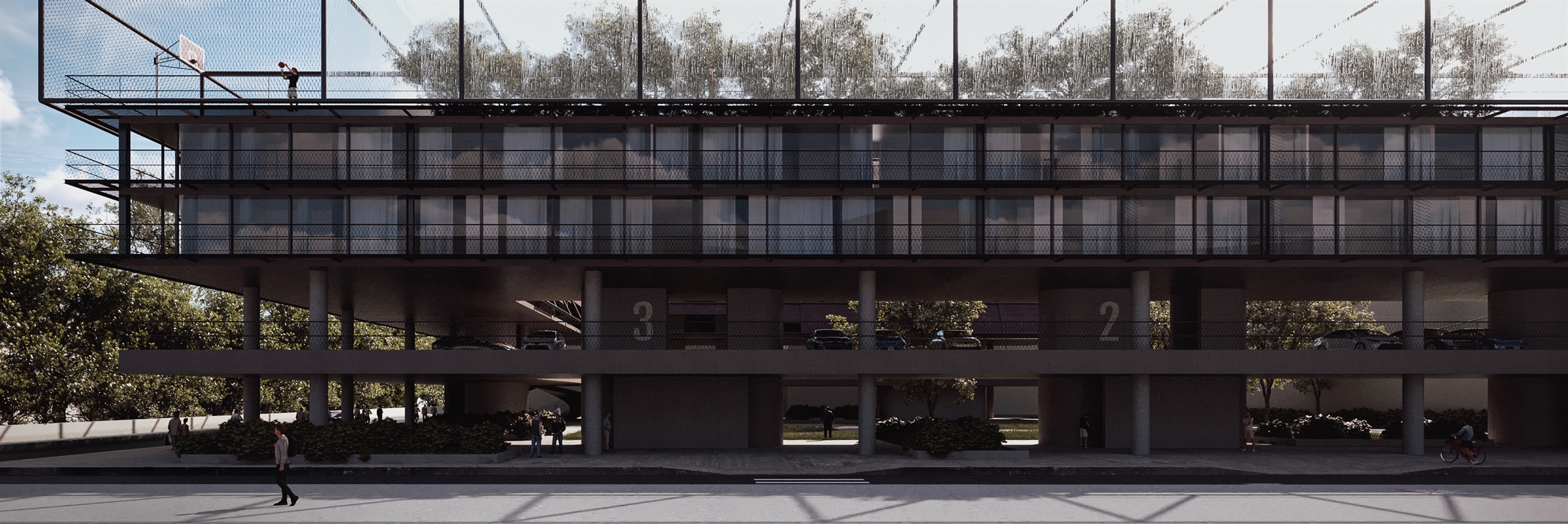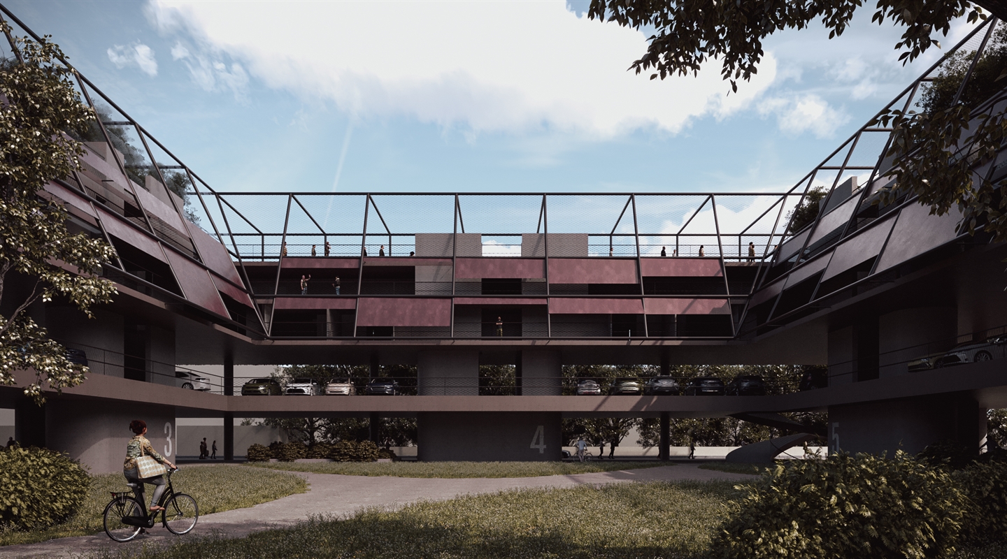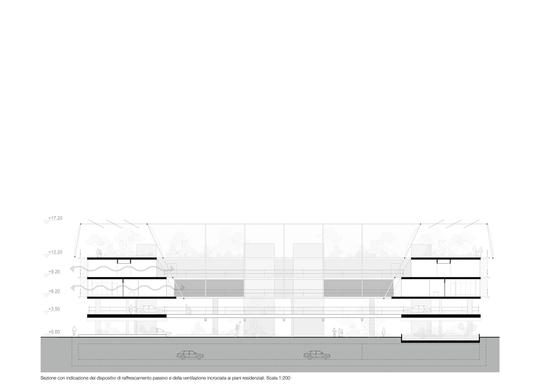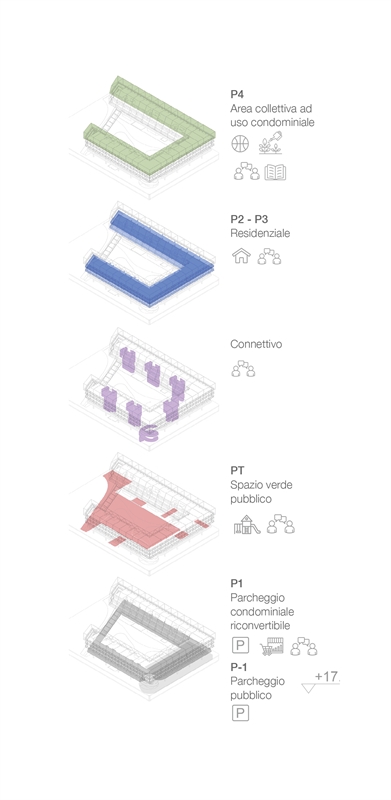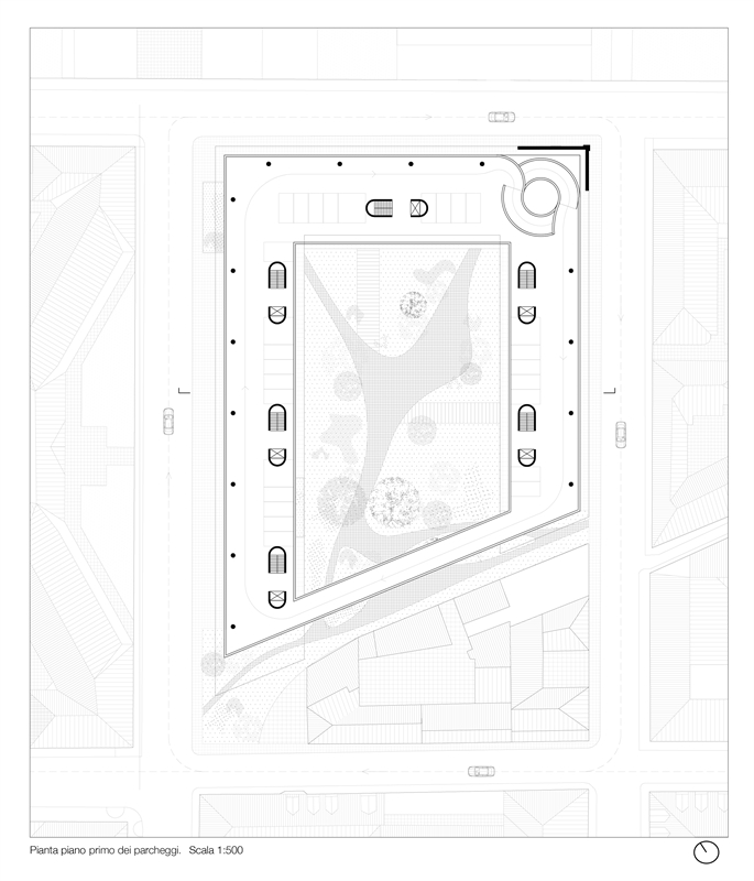 Si predispone la ridistribuzione dell’area attualmente adibita a parcheggio per liberare il piano terra e renderlo permeabile alla viabilità ciclopedonale, a seguito del quale si prevede un piano parcheggi ad uso dei residenti, caratterizzato da uno spazio flessibile e riconvertibile ad uso condominiale/pubblico (mercato; piazza coperta), permettendo usi alternativi sia temporanei che a lungo termine.
