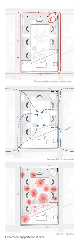 I flussi carrabili sono stati modificati dall’eliminazione dei posti auto dalla piazza, suddividendoli in due nuovi parcheggi, uno interrato sul lato nord del lotto a destinazione pubblica, e l’altro sopraelevato a uso comune dei residenti nel nuovo complesso residenziale cooperativo.