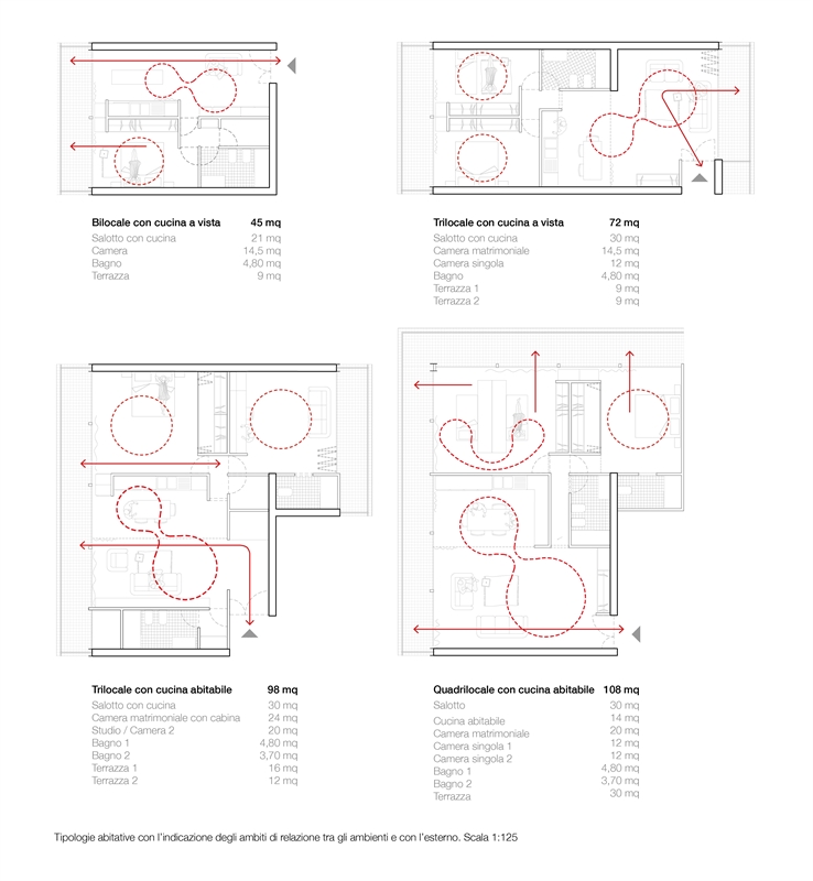 Il “vivere insieme” è matrice del progetto dell’abitare, che si compone degli ambienti della casa a partire dal modulo 3x3 metri che, nella sua ripetizione, esplicita i rapporti domestici e con l’esterno. Nella casa si concretizza la strategia insediativa dell’intero complesso, infatti lo spazio domestico si pone quale soglia e momento di passaggio tra due spazi esterni, seppur diversi. Inoltre, il doppio affaccio degli appartamenti che guardano verso l’interno della corte e verso il brano di città sui quali affacciano, è stato considerato un parametro di grande importanza in una più ampia valutazione sulla qualità dell’abitare. Gli ambienti domestici sono stati progettati prevedendo una flessibilità della pianta e possibili ambiti di relazione tra i diversi ambienti.